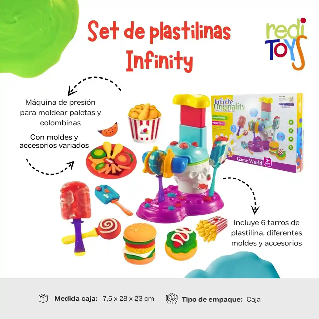 Set de plastilinas con máquina de presión para moldear paletas y colombinas Incluye 6 tarros de plastilina, diferentes moldes y accesorios para mayor diversión Práctico de usar, fomenta la imaginación y la creatividad, desarrollar habilidades motoras y la coordinación viso-manual.