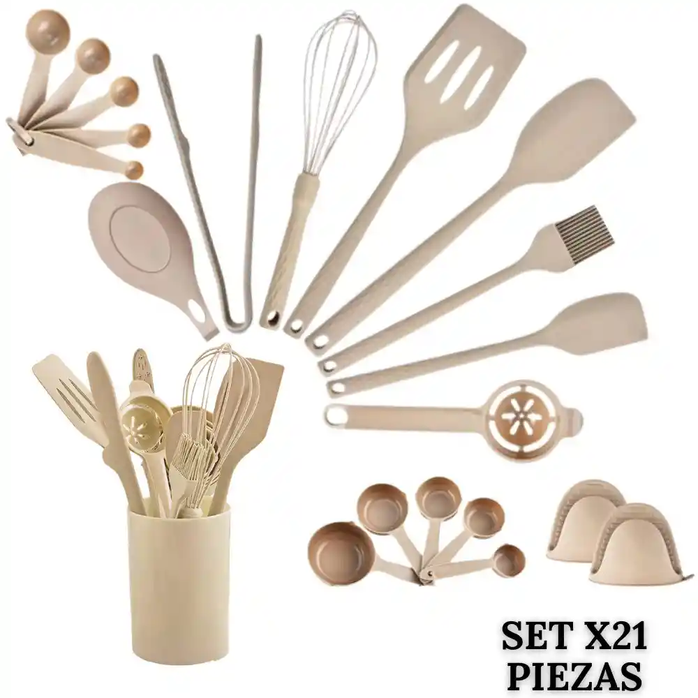 Set De Utensilios Para Cocina X21 Piezas En Silicona Beige Renueva tu experiencia en la cocina con este completo set de 21 utensilios de silicona, diseñado para cubrir todas tus necesidades culinarias con estilo y practicidad. Elegancia y Eficiencia en tu Cocina: Set de 21 Utensilios Para Cocina Con Soporte de almacenamiento. Nuestro set es la combinación perfecta de funcionalidad y estilo. Equipa tu cocina con estas herramientas esenciales y transforma la forma en que preparas tus comidas. Características: - Variedad de utensilios: Este set incluye una selección de medidores, espátulas, pinzas, batidores y mucho más para satisfacer todas tus necesidades en la cocina. - Soporte Elegante: El soporte incluido no solo mantiene tus utensilios organizados y al alcance, sino que también agrega un toque de estilo a tu cocina. Mantén tus herramientas a la vista y ordenadas. - Mango Ergonómico: Los mangos de los utensilios están diseñados para ofrecer un agarre cómodo y seguro, lo que facilita el manejo y control durante el uso. El Set incluye – 1 Espátula sólida grande – 1 Espátula sólida pequeña – 1 Espátula ranurada – 1 Separador de huevo – 2 Guantes de horno – 1 Mini Cuchara medidora 1/4 tsp - 1.25 ml – 1 Mini Cuchara medidora 1/2 tsp - 2.25 ml – 1 Mini Cuchara medidora 1 tsp - 5 ml – 1 Mini Cuchara medidora 1/2 tbsp - 7.5 ml – 1 Mini Cuchara medidora 1 tbsp - 15 ml – 1 Cepillo para aceite – 1 Mini Taza medidora 1/8 Cup - 30 ml – 1 Mini Taza medidora 1/4 Cup - 60 ml – 1 Mini Taza medidora 1/3 Cup - 80 ml – 1 Mini Taza medidora 1/2 Cup - 125 ml – 1 Mini Taza medidora 1 Cup - 250 ml – 1 Soporte Bandeja para utensilios – 1 Pinza – 1 Batidor – 1 Porta utensilios