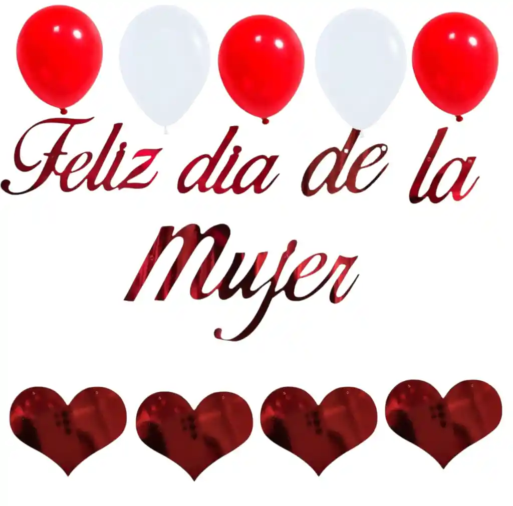 Set Feliz Día De La Mujer, Para Decoraciones, Celebraciones, Fiestas, Contiene:1 Letrero en Papel Metalizado Feliz Día De La Mujer, 5 Globo Latex, 4 Corazones En Papel Metalizado