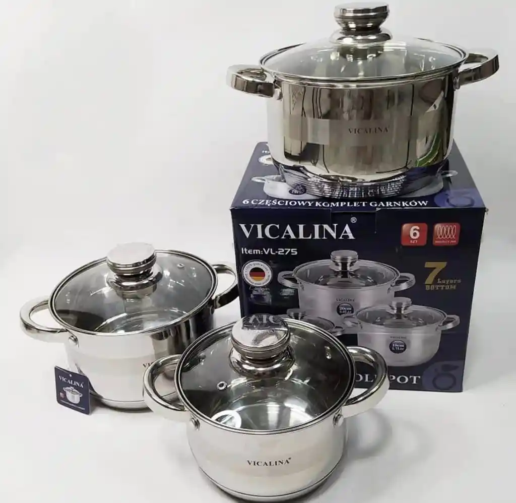 ollas de acero quirurgico de alta calidad en la que podrás cocinar alimentos sanos Ollas y tapas de cristal. Los utensilios de cocina están fabricados en acero quirurgico de alta calidad con una combinación de superficies brillantes y mate. Las tapas transparentes con salidas de vapor permiten controlar el proceso de cocción. Los diámetros de los productos corresponden a los tamaños generalmente aceptados de quemadores en estufas domésticas. CARACTERÍSTICAS: * Tiene alta resistencia mecánica * Fondo encapsulado de cinco capas * Asas metálicas remachadas * Escala de medición * Fondo de inducción * Material: Acero Inoxidable PAQUETE INCLUYE: * 3 Ollas de acero quirurgico 20cm( 3,6l) 18cm( 2,7L) 16cm( 1,9L) * 3 Tapas de vidrio
