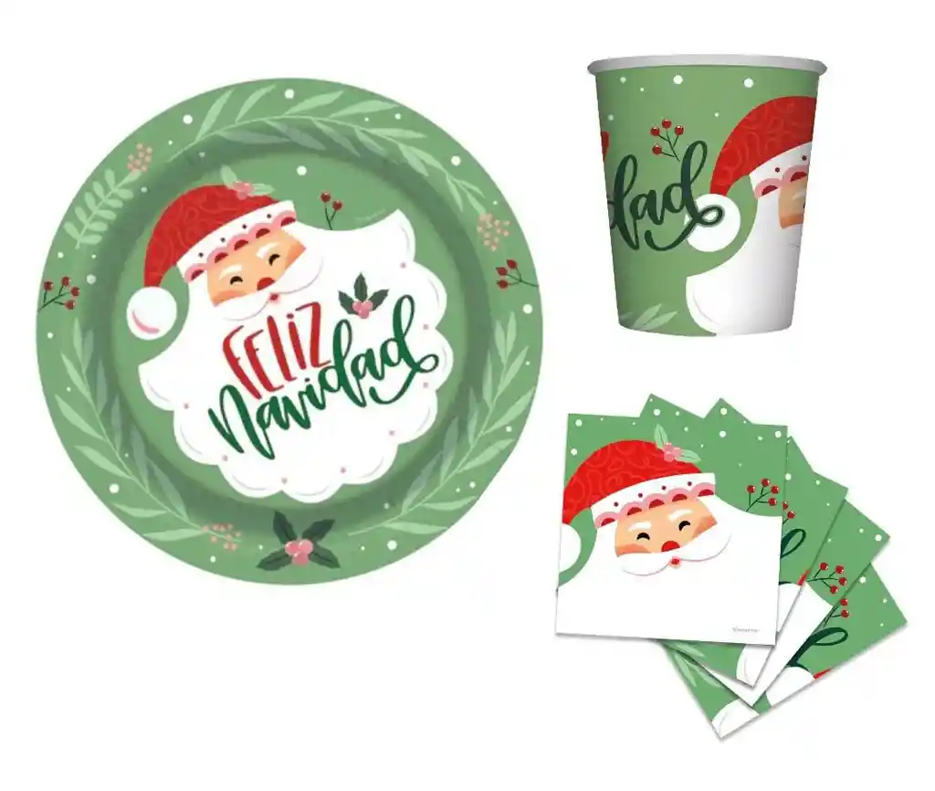 Set Platos, Vasos Y Servilletas X8 Navidad Santa Feliz Sempertex