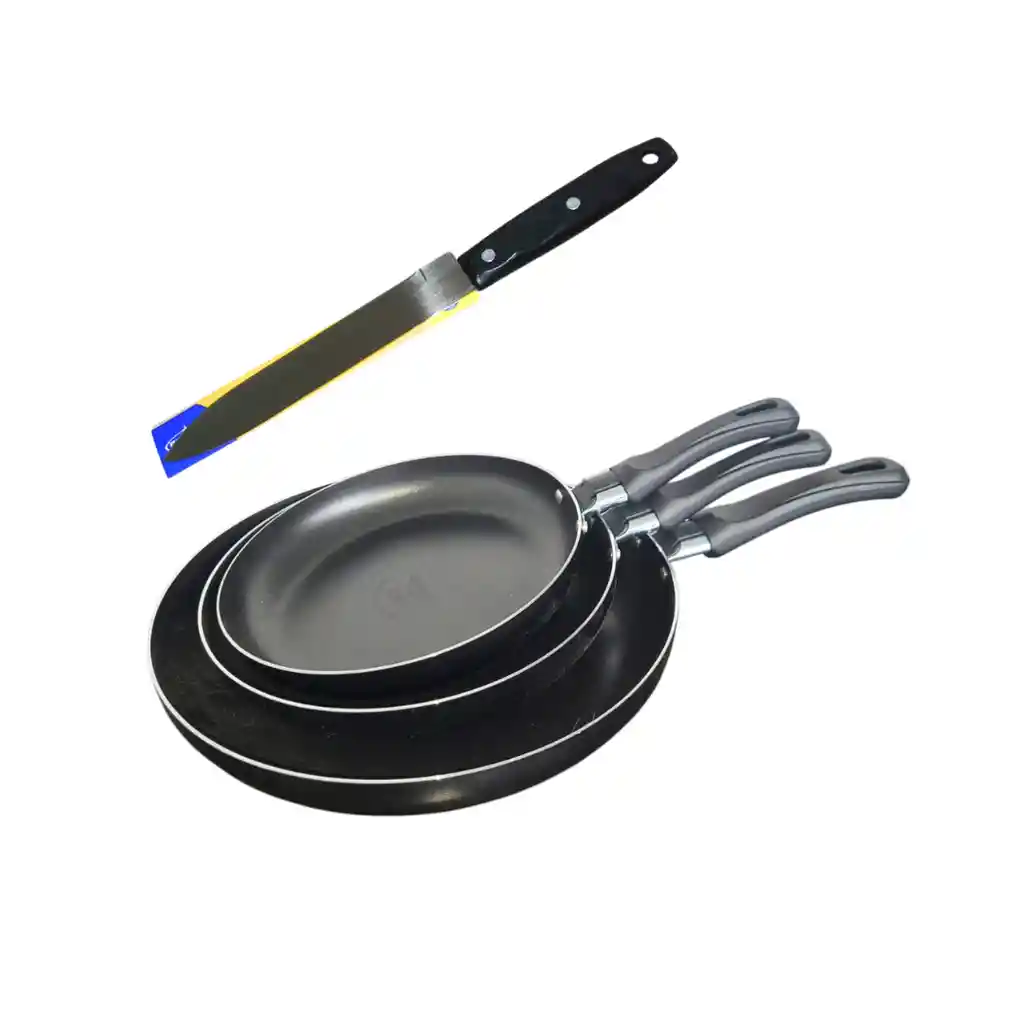 Las sartenes son un elemento básico del menaje de cocina. Son imprescindibles para realizar muchas preparaciones esenciales, como freír, tostar y dorar los alimentos. PESO 1KILO SARTEN 18CM SARTEN 20CM SARTEN 24CM CUCHILLO con mango de pasta