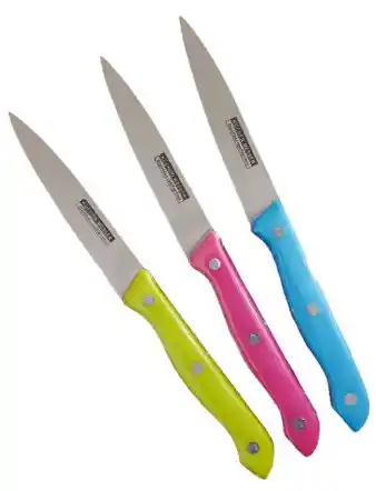 DESCRIPCION: Set x3 Cuchillos C/mango Acero Colores -MEDIDAS: 22.5 x 2 cm COLOR: Verde, rosa y celeste MATERIAL: Acero y plastico Hoja de acero. Mango de plástico. Largo de la hoja de 11.5cm. Es apto para lavavajillas.