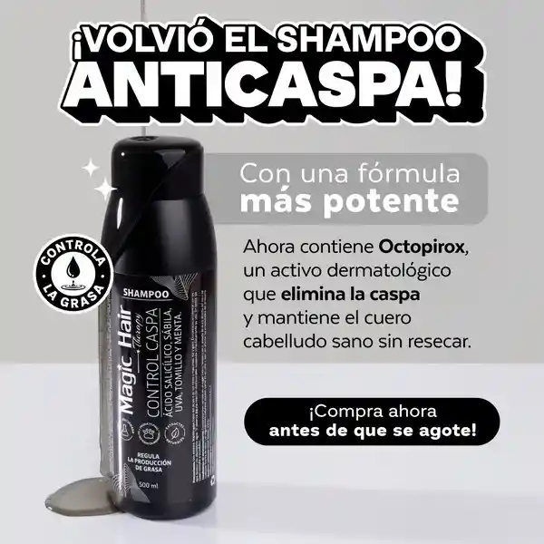 ¡VOLVIÓ EL SHAMPOO ANTICASPA! El producto que más nos pedían está de regreso… ¡y con fórmula renovada! 🖤 CONTIENE: Ahora incluye Octopirox, un activo dermatológico de última generación que combate los hongos causantes de la caspa y equilibra el exceso de grasa. Además, alivia la picazón e irritación, dejando el cabello limpio, saludable y con brillo natural. Acondicionador Anticaspa a un precio especial, ideal para ofrecer la rutina completa y potenciar resultados. ✅ 💨 ¡Se agota rápido cada vez que vuelve! No te quedes sin stock y haz tu pedido hoy mismo. 📦