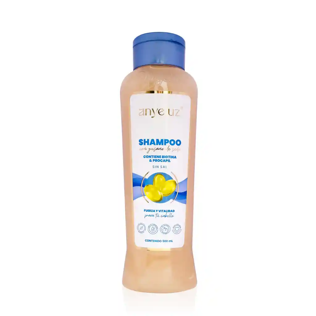 SHAMPOO GUSANO DE SEDA ANYELUZ Aumenta la elasticidad, suavidad, fuerza y el brillo natural del cabello. Proteger el cabello de la deshidratación. Actúa como una película protectora que impide que los productos alcalinos presentes en diferentes cosméticos dañen el cabello. Repara el cabello. Lo puedes usar cada vez que desees lavarte el cabello. Modo de uso: Aplicar en el Cabello en forma de masajes circulares con la yema de los dedos y dejarlo actuar por 3 minutos masajeando suavemente, enjuagar y repetir si es necesario.