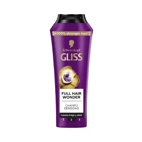 Shampoo Schwarzkopf Gliss Full Hair Wonder con Cafeína + Péptidos. Limpia y cuida. Activa factores de crecimiento capilar. Fortalece el pelo desde la raíz. Con fragancia almizclada y floral.