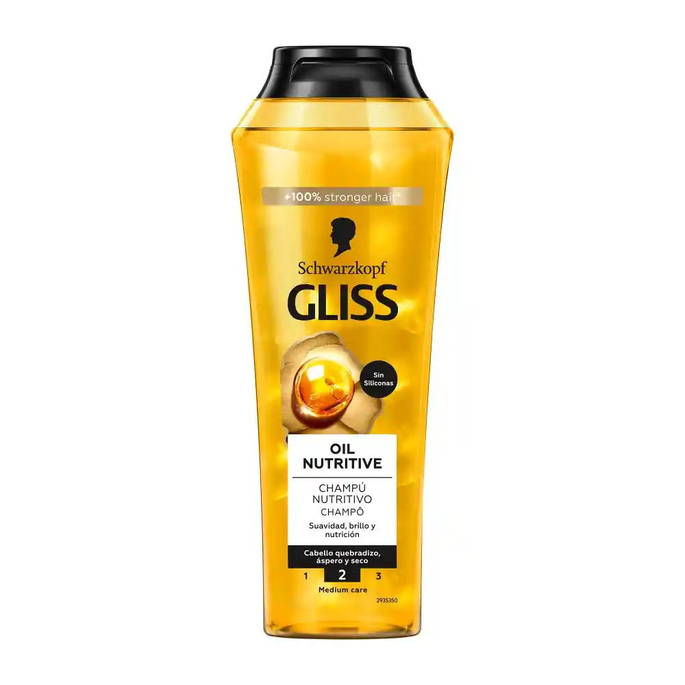 Shampoo Schwarzkopf Gliss Oil Nutritive con Omega 9 + Aceite de Marula. Limpia y cuida. Nutre intensamente. Pelo suave y brillante. Con una fragancia rica e intensa. Protege el cabello.