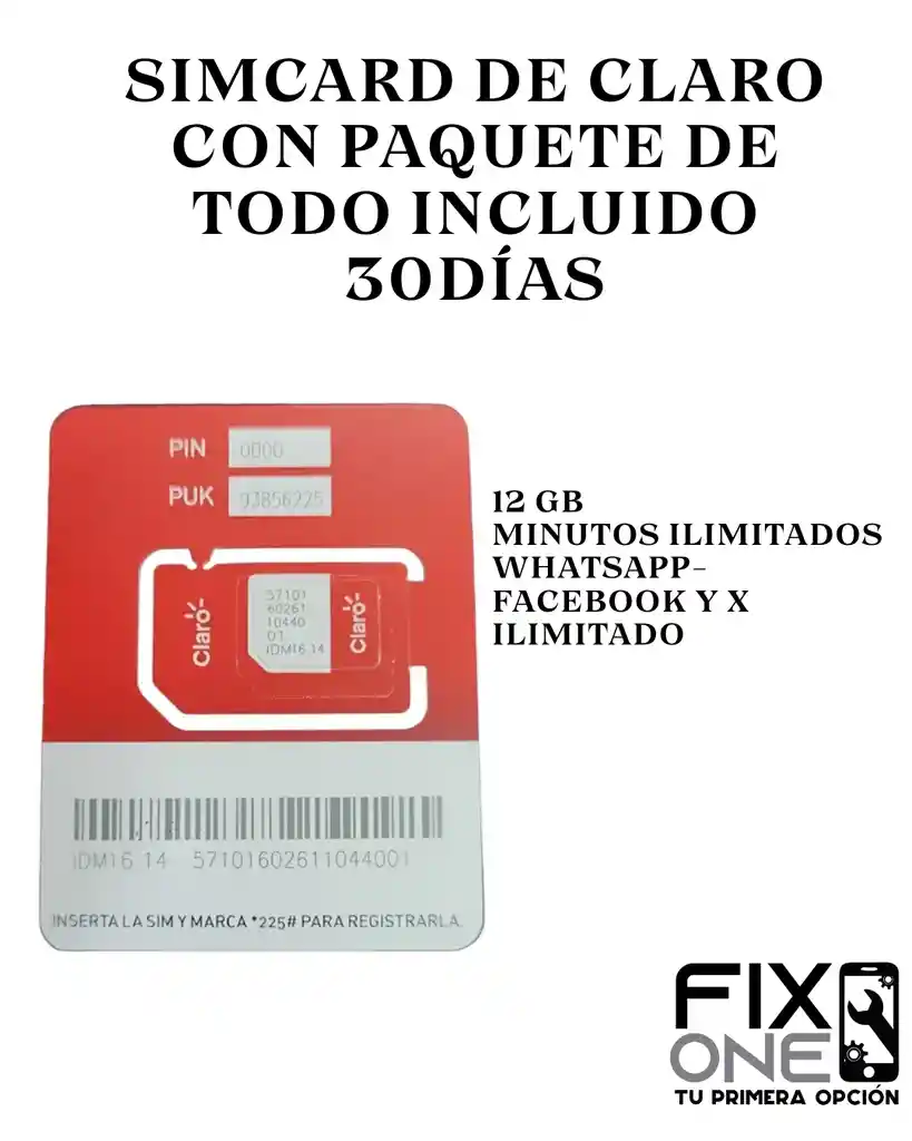 Simcard de Claro con paquete de todo incluido 30Días -12gb -Minutos y Mensajes Ilimitados -Redes ilimitadas