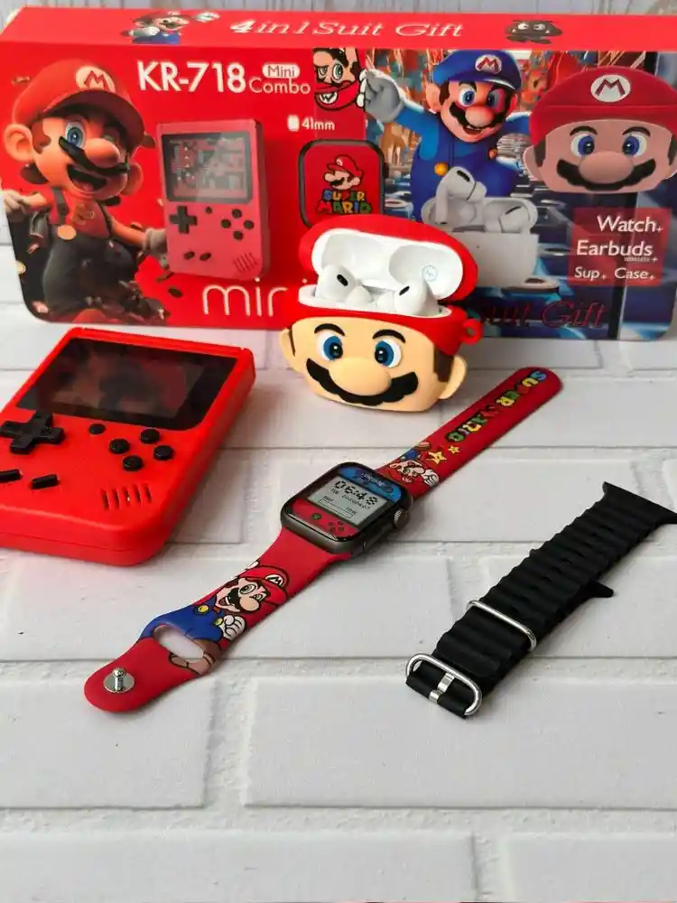 Combo 6 en 1 combo niños, audífonos pro (duración de carga de 2-3 horas), case animado, reloj inteligente mini de 41mm (hace llamadas, recibe llamadas, notifica apps, comando de voz, sistemas de salud y deporte), 1 pulso animado, 1 pulso ultra, video juegos 500 en 1, cuenta con 500 juegos diferentes y también cuenta con el cable para conectar al TV