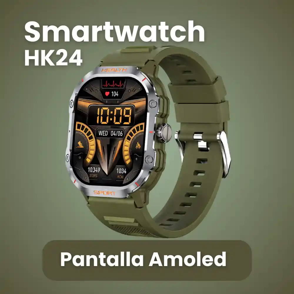 El Smartwatch HK24 es un reloj inteligente de diseño deportivo y robusto, equipado con pantalla AMOLED de 2.01 pulgadas, funciones de llamadas Bluetooth, monitoreo básico de salud y modos deportivos. Incluye dos correas intercambiables, lo que permite adaptar su estilo al uso diario o deportivo. ⚙️ Características principales ✦ Pantalla AMOLED a color ✦ Tamaño de pantalla indicado en la caja: 2.01” (large screen) ✦ Llamadas Bluetooth directamente desde el reloj (Bluetooth Call) ✦ Gestión de música desde el smartwatch ✦ Medición de frecuencia cardíaca (Heart Rate) ✦ Registro de actividad física (Sport) ✦ Monitoreo del sueño (Sleep) ✦ Notificaciones de mensajes (Message) ✦ Diseño deportivo con bisel robusto y botones físicos laterales ✦ Compatible con la aplicación Da Fit (según código QR del empaque) Importante: las funciones de salud son orientativas y no sustituyen equipos médicos. 📦 Incluye 1 Smartwatch HK24 1 correa instalada (color verde militar) 1 correa adicional intercambiable (color negro) 1 cable de carga magnético USB 1 manual de usuario 📐 Especificaciones técnicas ✦ Modelo: HK24 ✦ Tipo de pantalla: AMOLED ✦ Tamaño de pantalla: 2.01 pulgadas ✦ Conectividad: Bluetooth ✦ Funciones destacadas: - Llamadas Bluetooth - Control de música - Frecuencia cardíaca - Monitoreo de sueño - Modos deportivos - Notificaciones de mensajes ✦ Aplicación compatible: Da Fit ✦ Batería: Litio recargable (integrada) ✦ Método de carga: Cable magnético USB ✦ Material de la correa: Silicona ✦ Certificaciones impresas: CE, FCC, RoHS ✦ Origen: Fabricado en China 💡 Ideal para ✦ Usuarios que buscan un smartwatch con pantalla grande y AMOLED ✦ Personas que quieren recibir llamadas desde el reloj ✦ Uso diario, deportivo o casual ✦ Quienes desean cambiar fácilmente el estilo con correas intercambiables ✦ Seguimiento básico de actividad y bienestar