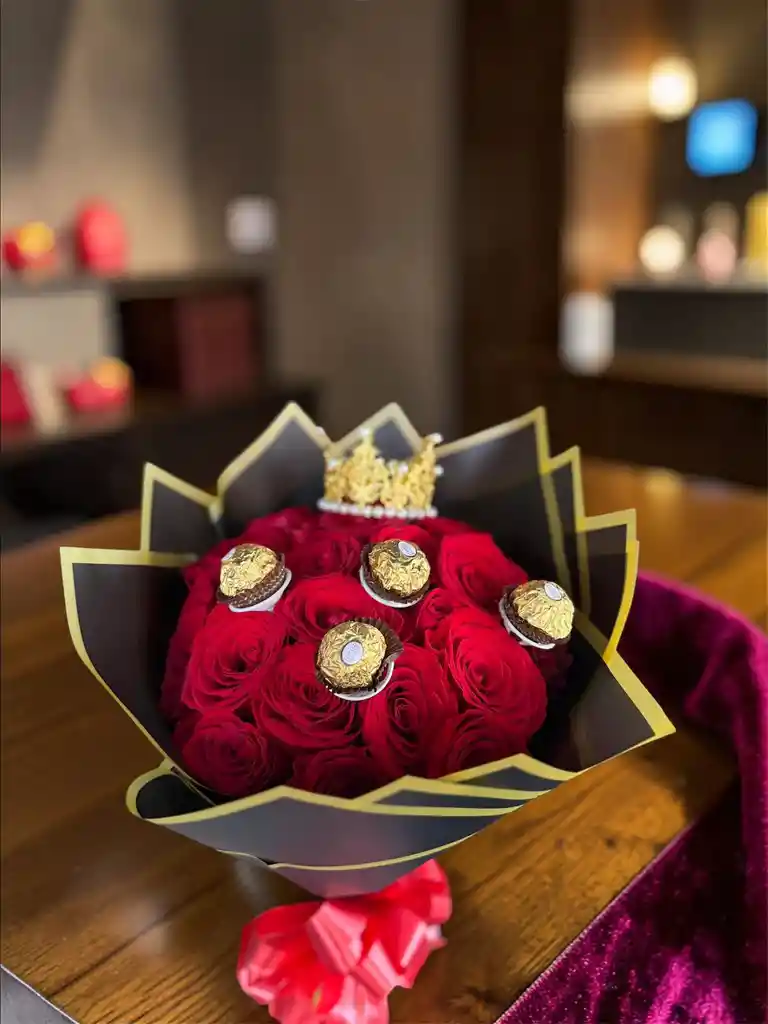 🌹🍡🍡Eleva tu regalo a un nivel de distinción superior con nuestro bouquet más exclusivo. En Loren's Floristería, transformamos el tradicional ramo de rosas en una experiencia sensorial que combina elegancia, dulzura y un toque de realeza. Este diseño de autor destaca por su impecable presentación: Base de Pasión: Una selección premium de Rosas Rojas de tallo perfecto, agrupadas para crear un domo de color intenso y aterciopelado. Detalle Real: Coronado con una delicada Tiara Dorada incrustada de perlas, que simboliza la importancia y el lugar especial que ocupa esa persona en tu vida. Toque de Dulzura: Decorado estratégicamente con Chocolates Ferrero Rocher, añadiendo un contraste dorado y una experiencia deliciosa al detalle. Envoltorio de Vanguardia: Sellado con Papel Coreano de alta calidad en tonos oscuros con bordes dorados, que realza el brillo de las rosas y le otorga un acabado moderno y sofisticado. Es el detalle definitivo para pedidas de mano, quinceañeras, aniversarios o para coronar a esa persona que lo merece todo.