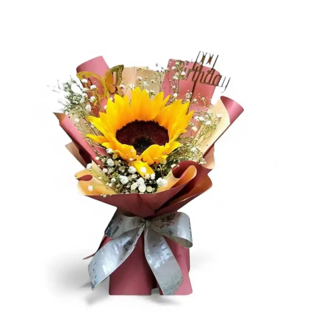 Solitario de girasol con gipsofilia, acompañado de una mariposa , envuelto en papel coreano