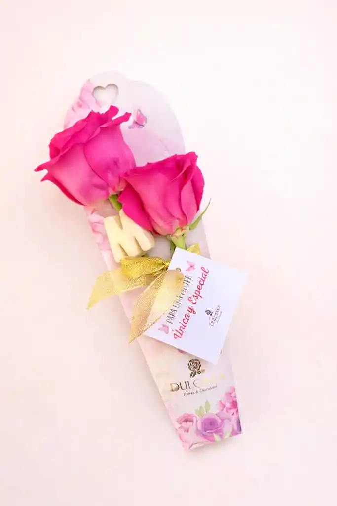 2 rosas naturales letra M de chocolate blanco o negro tarjeta dia de la mujer