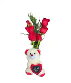 HERMOSO SOLITARIO DE 6 ROSAS CON FOLLAJE DE RUSCO Y SOLEAGO, CON UN PEQUEÑO PELUCHE COLOR CREMA