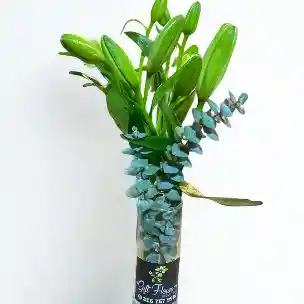 Solitario con aprox. 3 varas de lirios y eucalipto. Nota: La flor puede ser sustituida dependiendo la disponibilidad de color y del producto “Mensaje Personalizado” máximo de 30 caracteres (Dejar el mensaje en el chat, los comentarios no se previsualizan para la tienda por lo que si se dejan allí no podrá ser incluido).