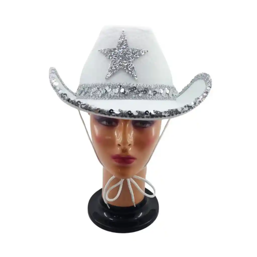 ¡Dale un toque chic al estilo del viejo oeste! Sombrero en tonos rosado y blanco, con estrella brillante al frente y borde decorado con lentejuelas. Perfecto para destacar en fiestas, disfraces o sesiones llenas de estilo.