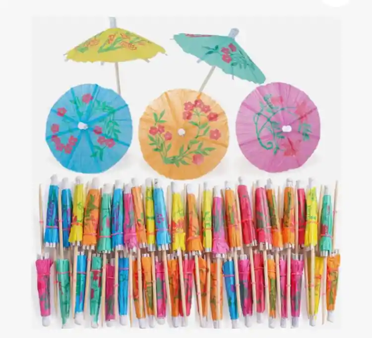 SOMBRILLITAS PARA CÓCTEL HECHAS DE PAPEL , IDEALES PARA DECORAR POSTRES O BEBIDAS MEZCLADAS. DISEÑO JAPONES, CHINO O HINDÚ, QUE HACE ALUSIÓN AL ORIGEN DEL PARAGUAS. CAJA POR 140 PIEZAS DE 10 CMS.