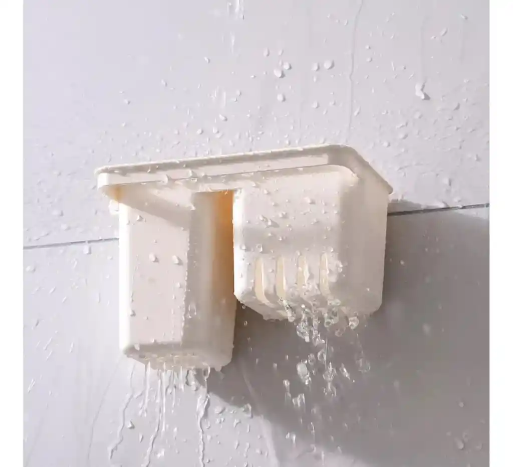 Material: Plástico. Color: Blanco o crema Instalación: Montado en la pared (probablemente con adhesivo o ventosa, no visible en la imagen). Uso: Diseñado para baño o cocina, ideal para escurrir utensilios o artículos de aseo. Diseño: Cuenta con orificios de drenaje en la parte inferior para permitir que el agua escurra, como se muestra en la imagen. Compartimentos: Tiene dos compartimentos separados.