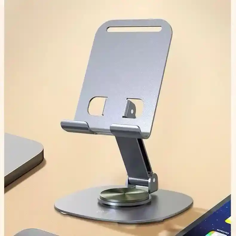 Soporte escritorio para celular aluminio giratorio de 360°, soporte de *tableta y teléfono ajustable .Minimalista práctico y Elegante.Soporte de aluminio resistente, de confección sólida y de alta calidad *Ángulo ajustable para tener una visibilidad óptima *Superficie antideslizante para mejor agarre y seguridad de tu dispositivo *Permite mantener el cable de carga conectado mientras está en uso *Accesorio plegable para fácil guardado cuando está en desuso *Compatible con todos los modelos de celulares *Color Gris oscuro.