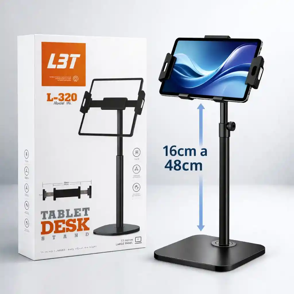 Mejora tu comodidad y organización con este soporte de escritorio ajustable para tablet, diseñado para brindar estabilidad, ergonomía y versatilidad en espacios de trabajo, estudio o negocio. Compatible con tablets cuyo ancho esté entre 16 cm y 26 cm, permite una sujeción firme y segura gracias a su sistema ajustable. Su estructura metálica resistente y base sólida garantizan estabilidad durante el uso continuo. Especificaciones: Compatible con tablets de 16 cm a 26 cm de ancho Altura máxima aproximada: 48 cm Ajuste de altura Ajuste de ángulo Base metálica estable Ideal para oficina, puntos de venta, estudio y uso en casa Este soporte es una solución práctica para videollamadas, clases virtuales, lectura, atención al cliente o trabajo diario.