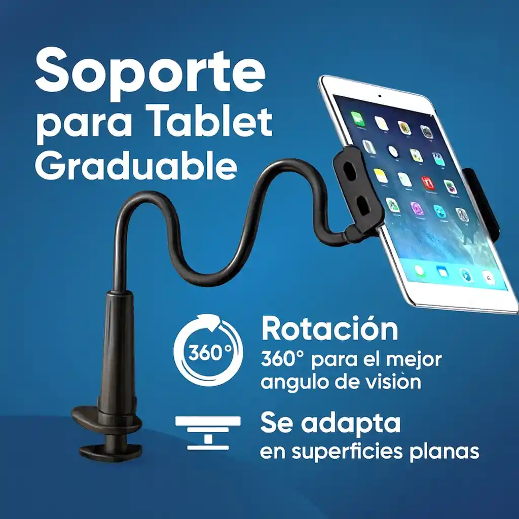 Soporte Para Celular o Tablet Graduable Flexible AE0024 Ficha Técnica: • Soporte Para Tablet • Rotación de 360 ° para el mejor ángulo de visión • Se adapta en superficies planas • Ajustable • El soporte Expande hasta 17cm • Ideal Para escritorios • Empaque Bolsa • Se puede usar con el celular pero en forma horizontal y se tapa la cámara