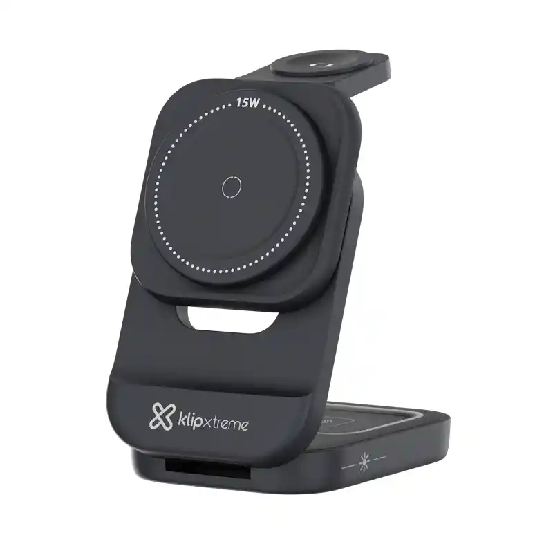 Soporte plegable de carga inalámbrica 3 en 1 KlipXtreme KDC-150 Presentamos el soporte plegable de carga inalámbrica 3 en 1 de KlipXtreme: un nuevo estándar para tus necesidades tecnológicas. Carga sin esfuerzo tu teléfono inteligente, reloj inteligente y audífonos simultáneamente, manteniendo tus dispositivos organizados y cargados. Su diseño elegante y plegable garantiza la portabilidad, lo que lo hace perfecto para el hogar o para viajar. Con capacidades de carga rápida y compatibilidad con varios dispositivos, mantenerse conectado nunca ha sido tan fácil. Soporte de carga inalámbrica 3 en 1 con tecnología de carga inductiva Qi® de triple bobina para cargar tu iPhone, Apple Watch, AirPods y una amplia gama teléfonos inteligentes compatibles y audífonos TWS con estuche habilitado para carga inalámbrica. Diseño plegable ultracompacto y ultraligero ideal para viajar. Cuando no lo uses, pliega el soporte hasta que tenga una pulgada de grosor y aproximadamente la mitad del tamaño de un smartphone para llevarlo en tu bolsillo o mochila dondequiera que vayas. Brazo inclinable con una plataforma de carga magnética deslizante para smartphones y una base de carga retráctil para tu Apple Watch. Ajusta la altura y la inclinación de tu smartphone y elige entre la visualización vertical u horizontal para ver la pantalla cómodamente mientras se carga. Una amplia área de carga de triple bobina para una alineación precisa y un fuerte agarre magnético que ja de forma segura tu smartphone para una carga vertical rápida y estable. Plataforma de carga inalámbrica plana de 3W para audífonos dentro de un estuche de carga compatible. Lámpara de noche LED integrada con intensidad regulable. Indicador LED del estado de carga. Rejilla de disipación de calor para un control óptimo de la temperatura. Cable de carga rápida USB-C® de 3 pies de largo.