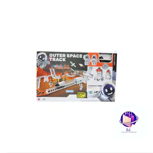 Pista Space Track con funcionamiento a batería, incluye vagones y astronautas de juguete. Diseño inspirado en el espacio con colores llamativos. Fabricada en material resistente y liviano, ideal para que los niños disfruten aventuras espaciales mientras el tren recorre la pista.