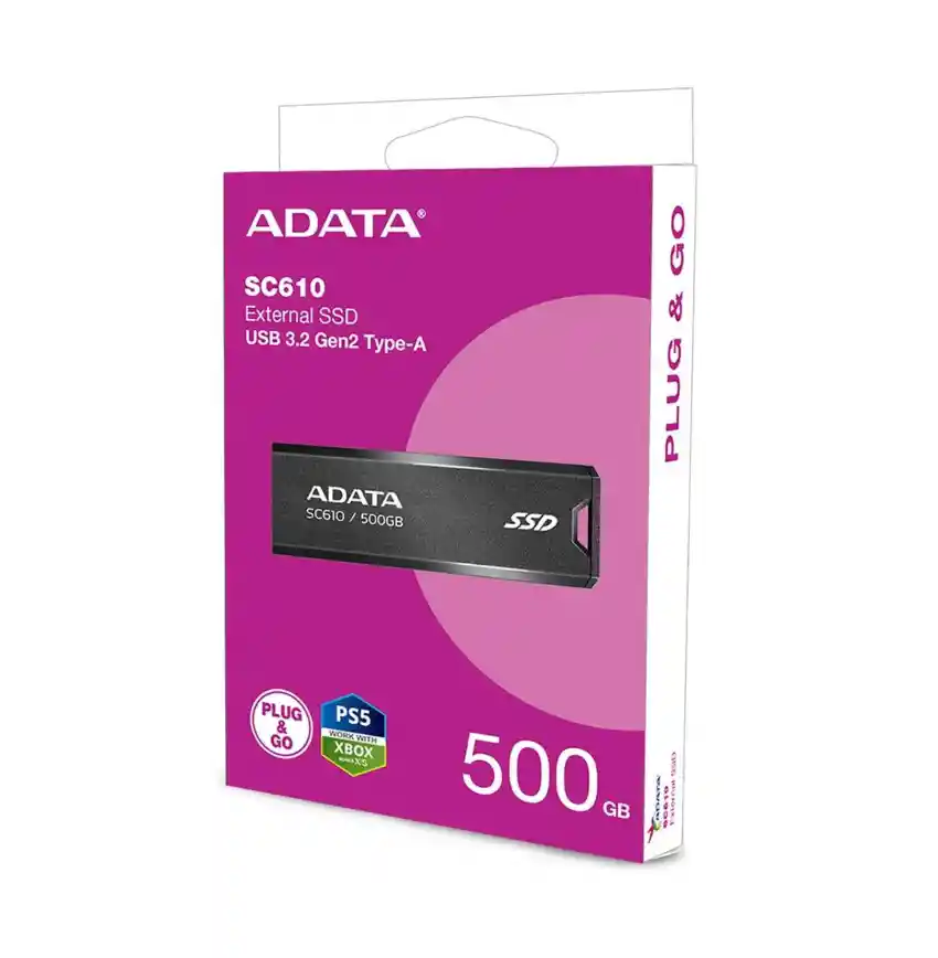 SSD externo ADATA SC610 de 500GB con conexión USB 3.2 Gen2. Alta velocidad de transferencia para archivos, videos y juegos. Compatible con PC, laptop, PS5 y Xbox. Diseño compacto Plug & Play.