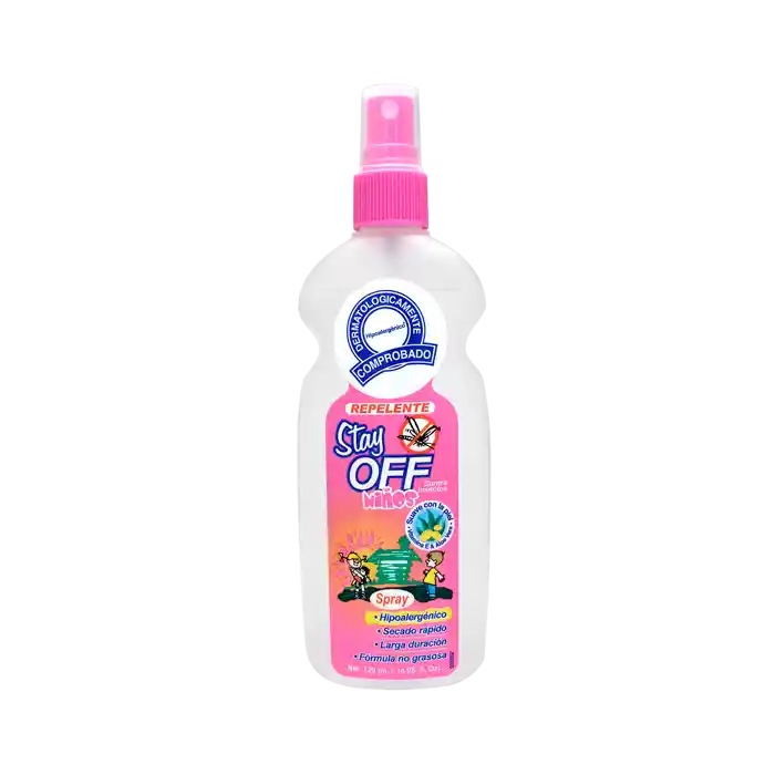 Repelente de insectos Stay OFF! Niños Spray 120 ml Protege a los niños a partir de los 12 meses de edad de picaduras de mosquitos que pueden transmitir enfermedades como Zika, Dengue y chikungunya. Su fórmula no grasosa , de secado rápido y de fácil aplicación con extracto de Aloe. Hipoalergénico y Dermatológicamente comprobado.