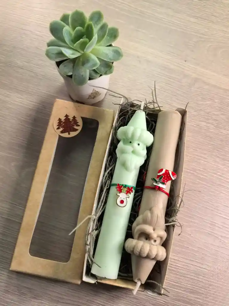 Detalle de navidad que contiene suculenta en matera de plástico y dos velas de papá noel decoradas. Las especies pueden llegar surtidas, los colores de las velas y los aromas pueden llegar surtidas.