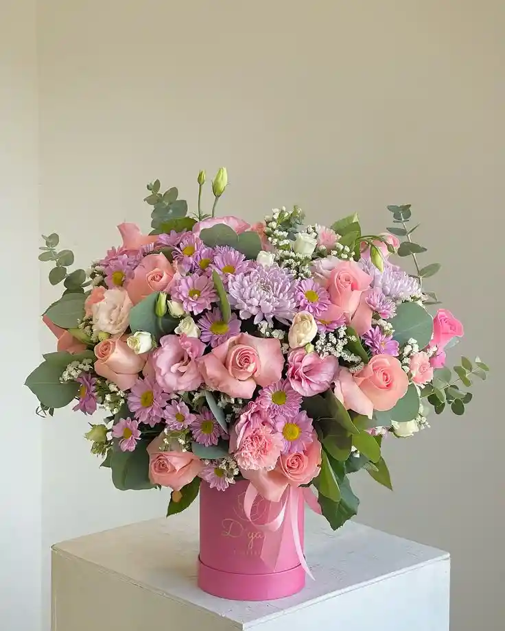 Un suspiro de primavera florece en cada rincón de esta creación encantadora. Rosas en tonos de algodón de azúcar, crisantemos lilas y toques de eucalipto se entrelazan en un abrazo de aromas dulces y colores suaves. Es un poema hecho flor, perfecto para expresar amor, ternura o gratitud. Cada pétalo parece decir: “la belleza también puede hablar con suavidad”.