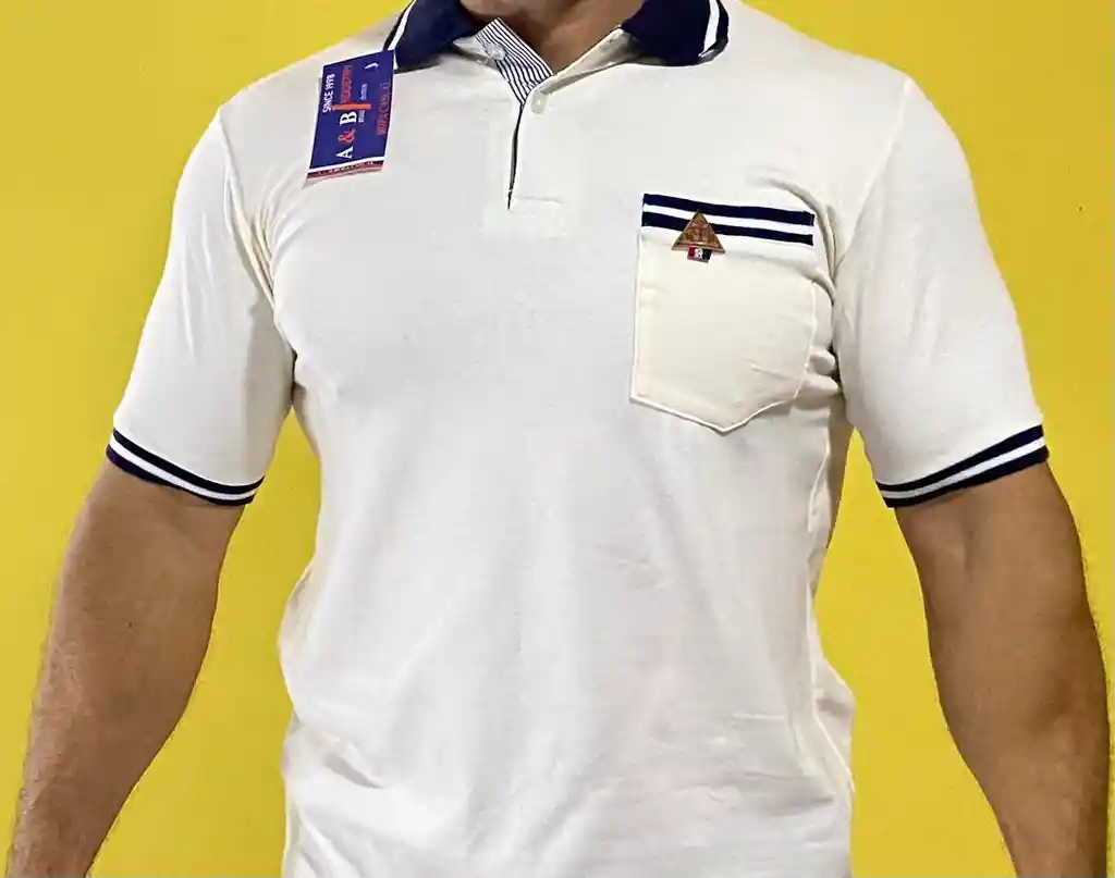 Suéter tipo polo para hombre, con cuello de dos botones, con bolsillo izquierdo, detalle en manga, cuello y bolsillo. Color: Beige con azul turquí. Talla: L Tela: algodón suave y fresco. Adecuado para cualquier ocasión, casual, formal, para combinar con bermudas, jeans o pantalón clásico. elegancia que se nota. Presencia que impacta.
