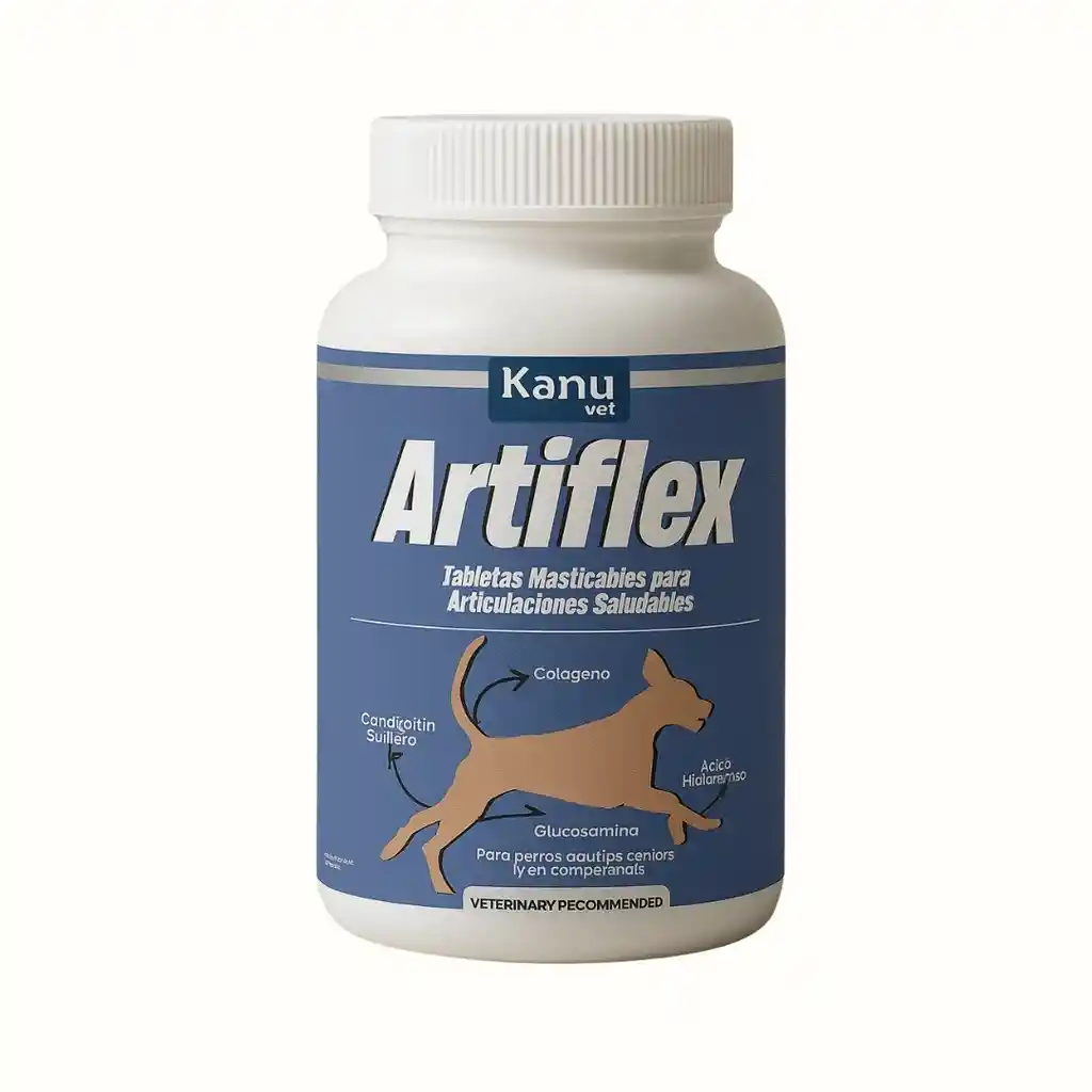 Kanu Vet Artiflex es un suplemento masticable formulado con colágeno, ácido hialurónico, condroitín sulfato y glucosamina, e ingredientes clave para el mantenimiento de articulaciones fuertes y saludables. Su fórmula ayuda a mejorar la movilidad y flexibilidad, contribuyendo a una mejor calidad de vida para perros adultos, senior y aquellos en competencia.
