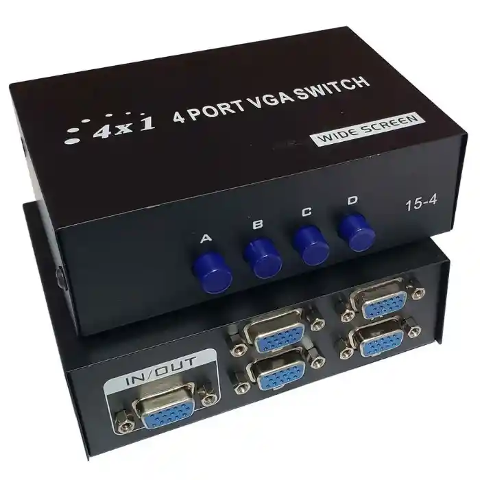 Switch VGA / Splitter VGA 4 Puertos Descripción Descripción Switch Vga 4 Puertos Resolución 1920 X1440 SWITCH VGA 4 PTOS RESOLUCION 1920×1440 Key Press Switch Funcionamiento: De 4 dispositivos selecciona cual mostrar en 1 Monitor De 1 dispositivo a 4 Pantallas No Requiere Fuente de Energía ni Configuracion