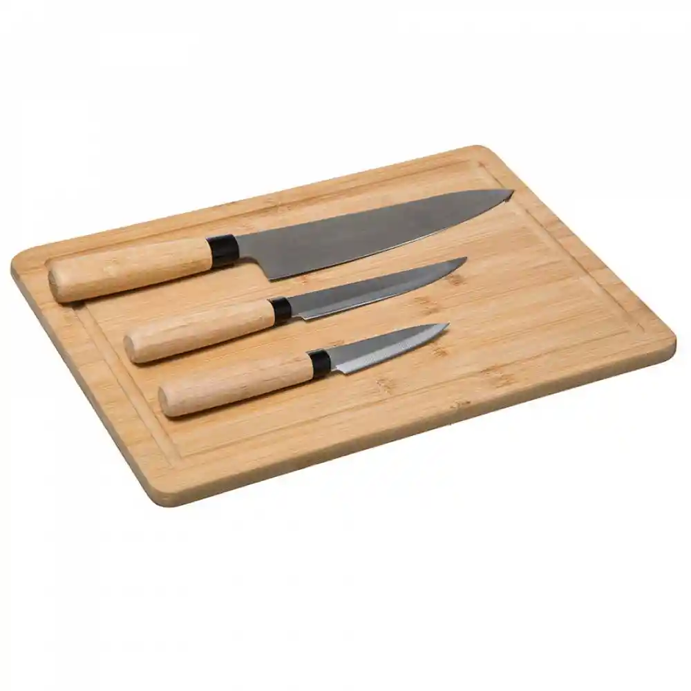 Pack tabla de cortar y 3 cuchillos. Pack de tabla de cortar de bambú con 3 cuchillos con mango de bambú y hoja...Ver más