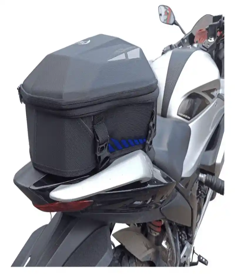 Material de eva termoformada o ABS, con base antideslizante. Sistema de fijación por correas (arnés) o anillo de sujeción rápida. Gran capacidad, a menudo expandible y con cubierta impermeable. Almacenamiento seguro y accesible para objetos voluminosos sobre el tanque de la moto