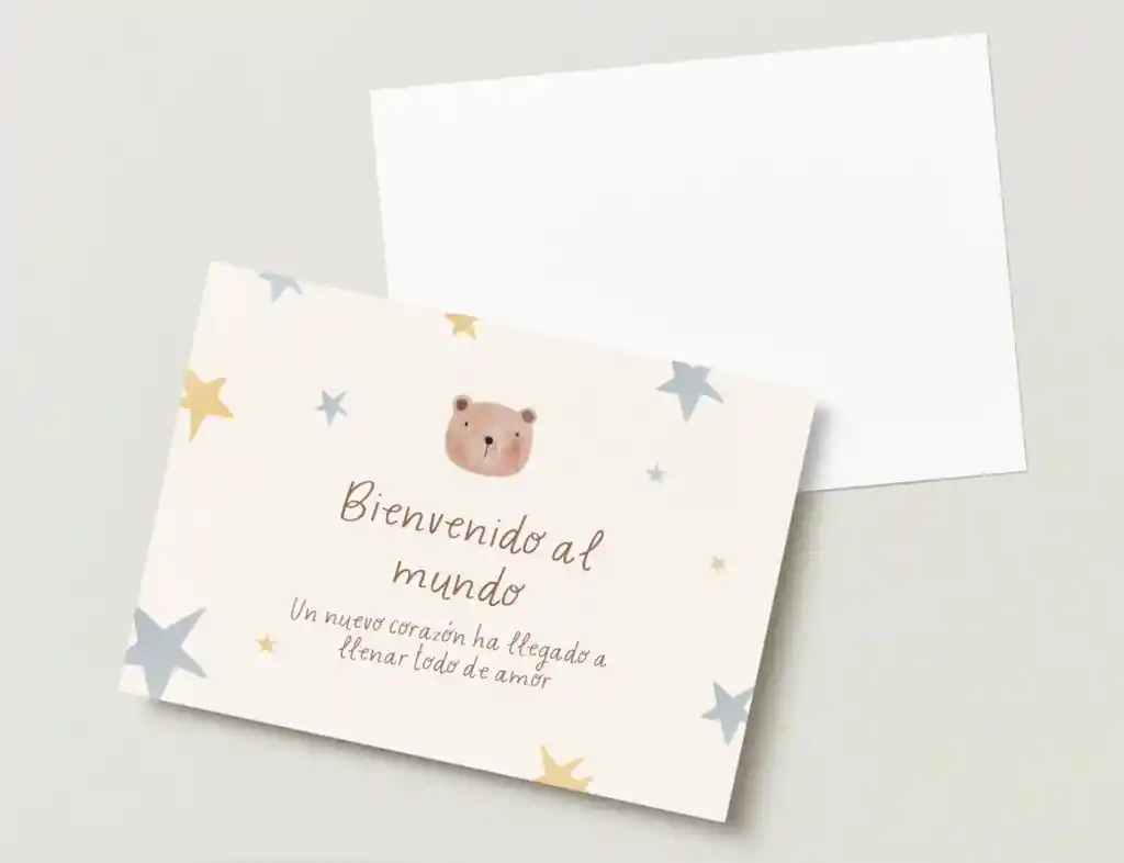 Tarjeta en sobre con mensaje personalizado de bienvenido al mundo