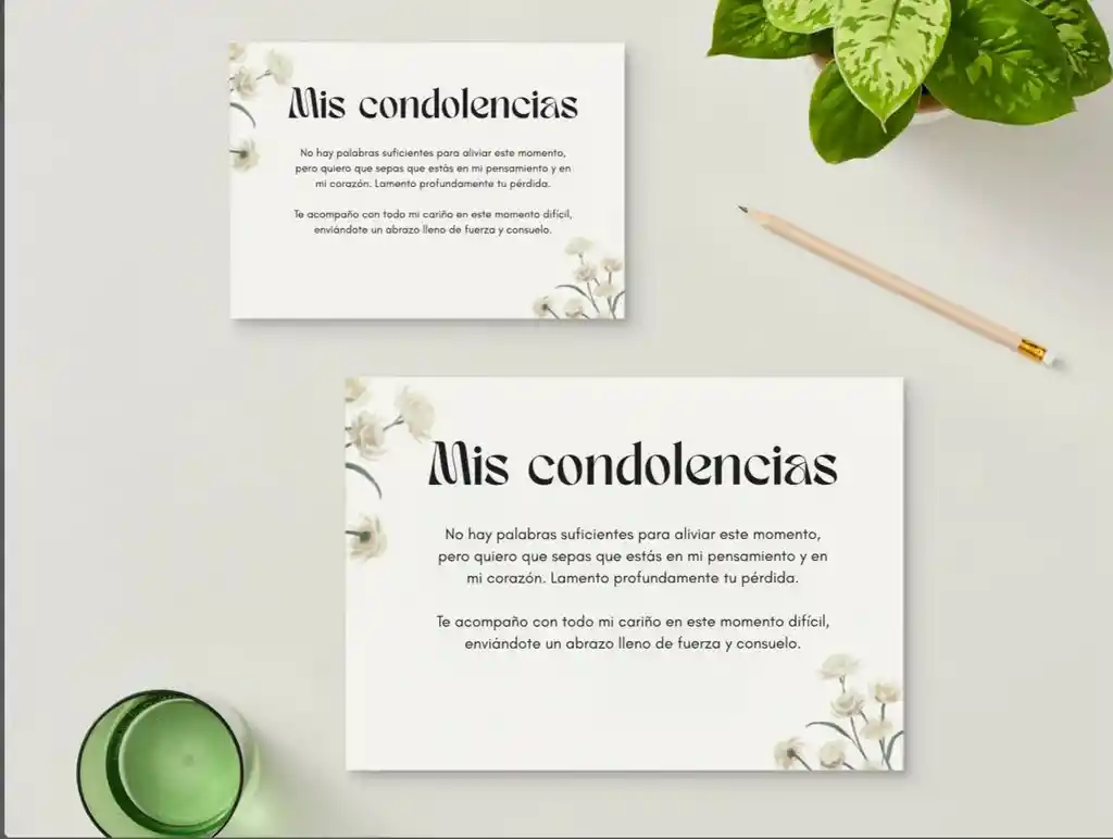 Tarjeta en sobre con mensaje personalizado de condolencias o sentido pésame