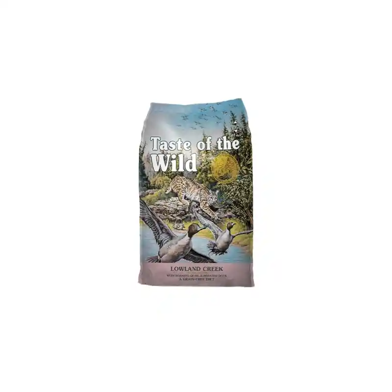 Taste of The Wild Lowland Creek es una fórmula sin cereales para gatos en todas las etapas de la vida, elaborado en base a carne de aves asadas, con un 12% de carne de pato aportando un 36% de proteína y un 16% de grasa. Formulado con codorniz y pato criados en libertad. Taste of the Wild Lowland Creek presenta probióticos específicos de la especie para el soporte digestivo e inmune, taurina para un corazón y ojos sanos, y antioxidantes de vegetales, legumbres y frutas para el bienestar general, tal como lo pretendía la naturaleza