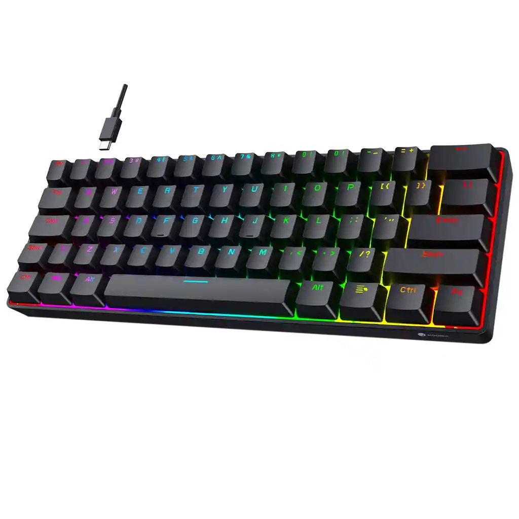 Categoría Teclado Mecánico Marca Havit Color Negro, RGB Dimensiones 29,5 x 11 x 3 cm Distribución 60%, QWERTY Tipo Teclado Mecánico Impresión de Teclas Láser, doble impresión Retroiluminado aRGB Switch Blue Vida Útil 20000.000 Pulsaciones Conexión USB Longitud del Cable 1.5m Tecnología Key Rollover Número de Teclas 61 Teclas Teclado Mecánico 60% H61K NegroRGB es un periférico ultracompacto diseñado para entusiastas y gamers que priorizan el espacio en el escritorio y la portabilidad. Su diseño al 60% omite el teclado numérico, la fila de funciones (F1-F12) y el clúster de navegación (flechas, Inicio, Fin, etc.), resultando en solo 61 teclas. Este diseño compacto permite que las teclas de funciones omitidas se accedan mediante combinaciones de teclas con la tecla ‘Fn’, optimizando la superficie para el movimiento del ratón durante el juego. Su rendimiento mecánico reside en sus switches Outemu Blue, que brindan una respuesta táctil y un sonido característico, además de una vida útil considerable al número de pulsaciones.