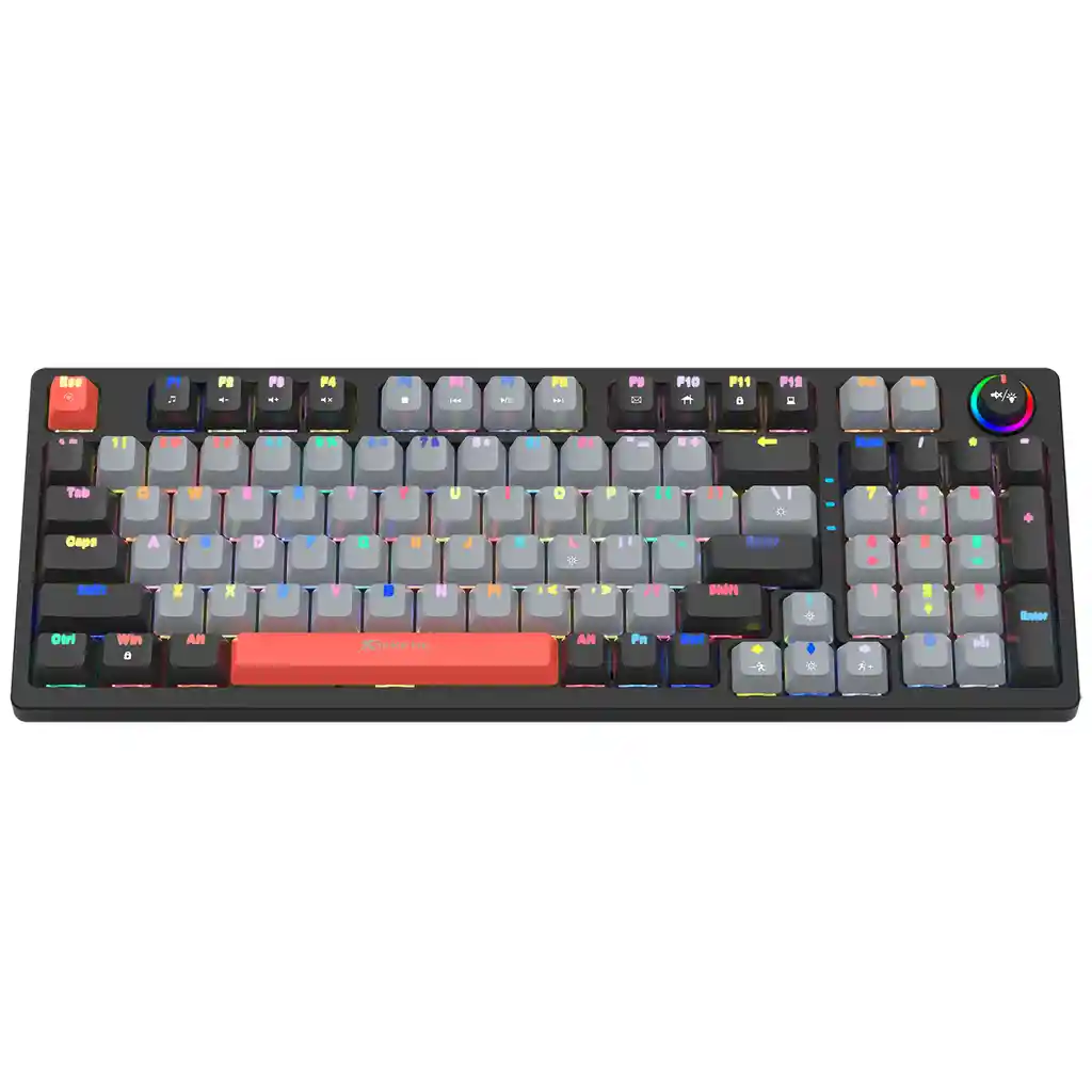 Categoría Teclado Mecánico Marca Gamertech Color Negro, RGB Tamaño 35,8 x 13 x 4,1 cm Distribución 75%, QWERTY Tipo Teclado Mecánico Impresión de Teclas Láser, doble impresión Retroiluminado aRGB Switch Blue, Otemu Vida Útil 50'000.000 Conexión USB Longitud del Cable 1.5m Tecnología Anti-Ghosting, Plug Play Número de Teclas 98 Teclas El Teclado Mecánico Gamer 75% RGB Gamertech GK987G es una excelente opción para los gamers y entusiastas que buscan un teclado compacto y personalizable. Su diseño de 75% ofrece un amplio espacio de trabajo sin ocupar demasiado espacio en el escritorio. Los switches Outemu Blue, proporcionan una experiencia de escritura y juego única, una respuesta táctil más pronunciada y la retroiluminación RGB personalizable te permite adaptar el teclado a tu estilo y ambiente, además cuenta con tecla especial multimedia para control de volumen.