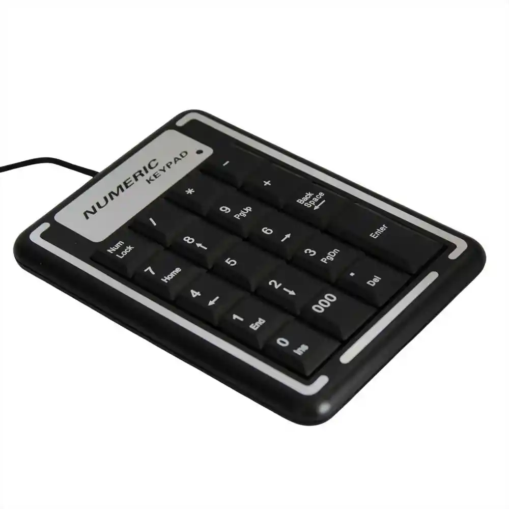 Es un dispositivo periférico diseñado para la introducción rápida y sencilla de datos numéricos. Cuenta con teclas numéricas del 0 al 9, así como teclas adicionales como Num Lock, Enter, Del y Back Space. Su diseño compacto es ideal para complementar computadoras portátiles que no tienen un teclado numérico integrado. Se conecta mediante un cable USB.