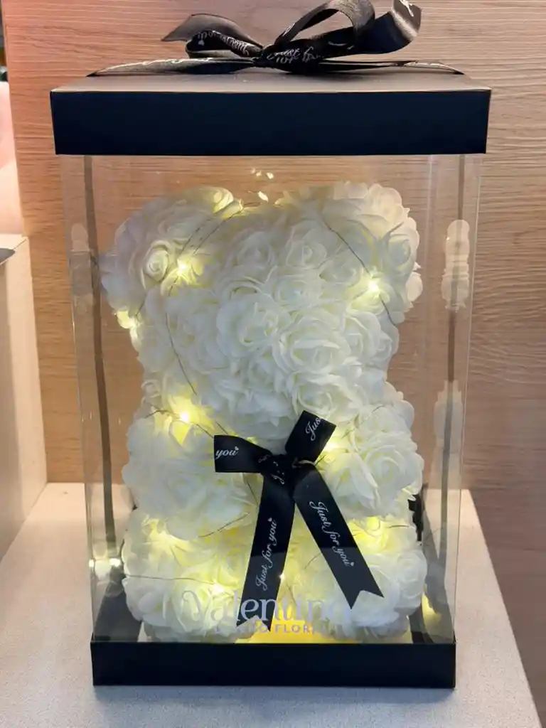 Hermoso oso elaborado con delicadas rosas blancas artificiales, presentado en caja de acetato premium con tapa y lazo decorativo. Incluye luces LED cálidas que realzan cada detalle, creando un efecto romántico y sofisticado. Un regalo duradero, elegante y lleno de significado, perfecto para cumpleaños, aniversarios, amor y ocasiones especiales.