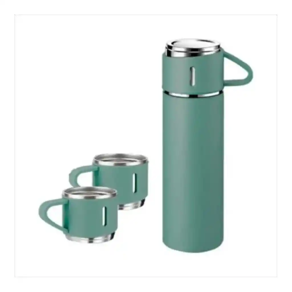 ¡Experimenta la excelencia en portabilidad y rendimiento térmico con nuestro Termo con Tazas Incluidas! Diseñado para satisfacer tus necesidades de bebidas calientes y frías mientras te acompaña a donde vayas. Este termo elegante y funcional es tu compañero perfecto para disfrutar de café, té u otras bebidas, manteniéndolas a la temperatura ideal durante horas. CARACTERISTICAS: •Acero inoxidable: Elegante y resistente, nuestro termo está construido con acero inoxidable de alta calidad, asegurando durabilidad y resistencia a la corrosión. •Doble pared aislada al vacío: Avanzada tecnología de doble pared que mantiene tus bebidas calientes o frías hasta por 12 horas, para que disfrutes en cualquier momento. •A prueba de fugas: Olvídate de preocuparte por derrames. La tapa hermética asegura un sellado perfecto, evitando fugas y manteniendo tus bebidas seguras en su lugar. •Capacidad ideal: Con un generoso volumen de 500 ml, nuestro termo es lo suficientemente grande para satisfacer tus necesidades diarias, pero lo suficientemente compacto para llevarlo a todas partes. •Incluye 3 tazas: Comparte tus bebidas favoritas con amigos o familia. El termo viene convenientemente con 3 tazas, perfectas para disfrutar de tus bebidas de manera cómoda y compartida.