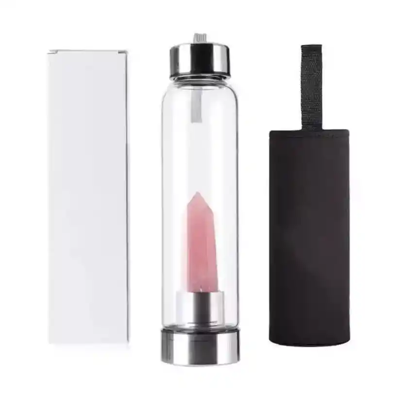 Termo Botella De Agua Con Cristales De Cuarzo Rosa + Estuche Negro