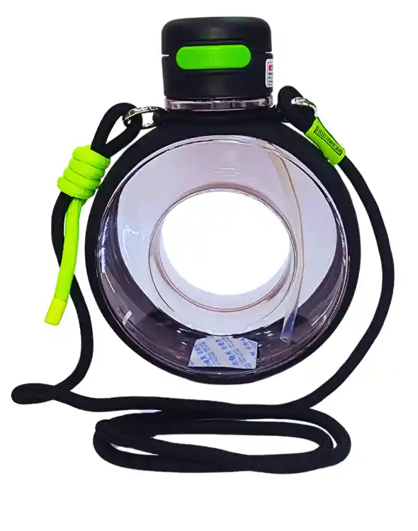 Termo circular de plástico, incluye pitillo y cordón para colgar, tipo de boquilla en rosca.