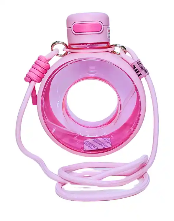 Termo circular de plástico, incluye pitillo y cordón para colgar, tipo de boquilla en rosca.