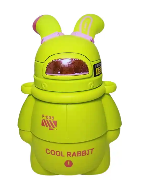 Termo en forma de conejo astronauta llamado cool rabbit, incluye cordon para llevar, material de acero inoxidable, pitillo siliconado y sistema rosca para apertura de tapa,.