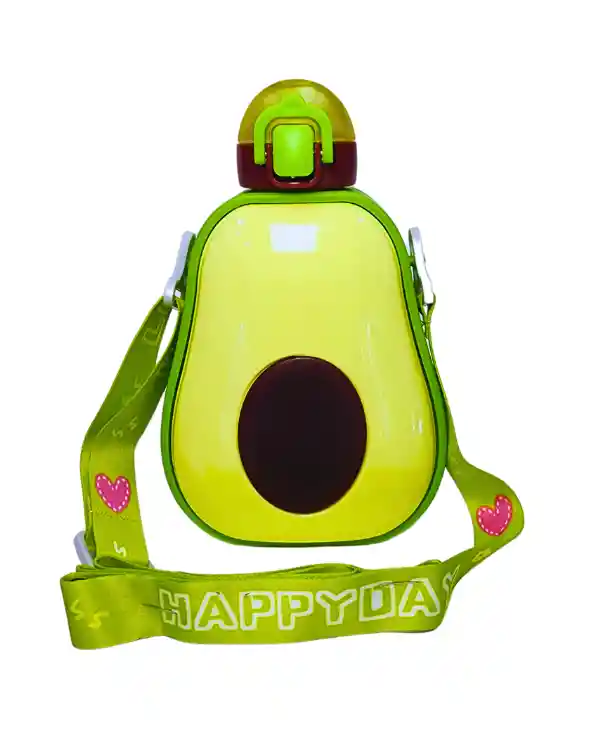 Termo de plástico en forma de agucate, tapa en rosca y pitillo siliconado, apto para bebidas frías, incluye correa para cruzarse
