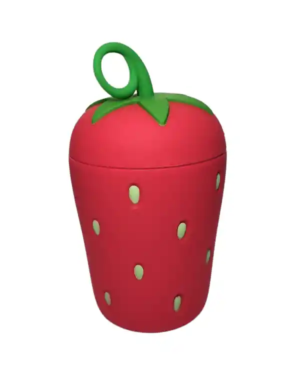 Vaso hermetico de vidrio recubierto de plástico en forma de fresa, sistema rosca para apertura de tapa